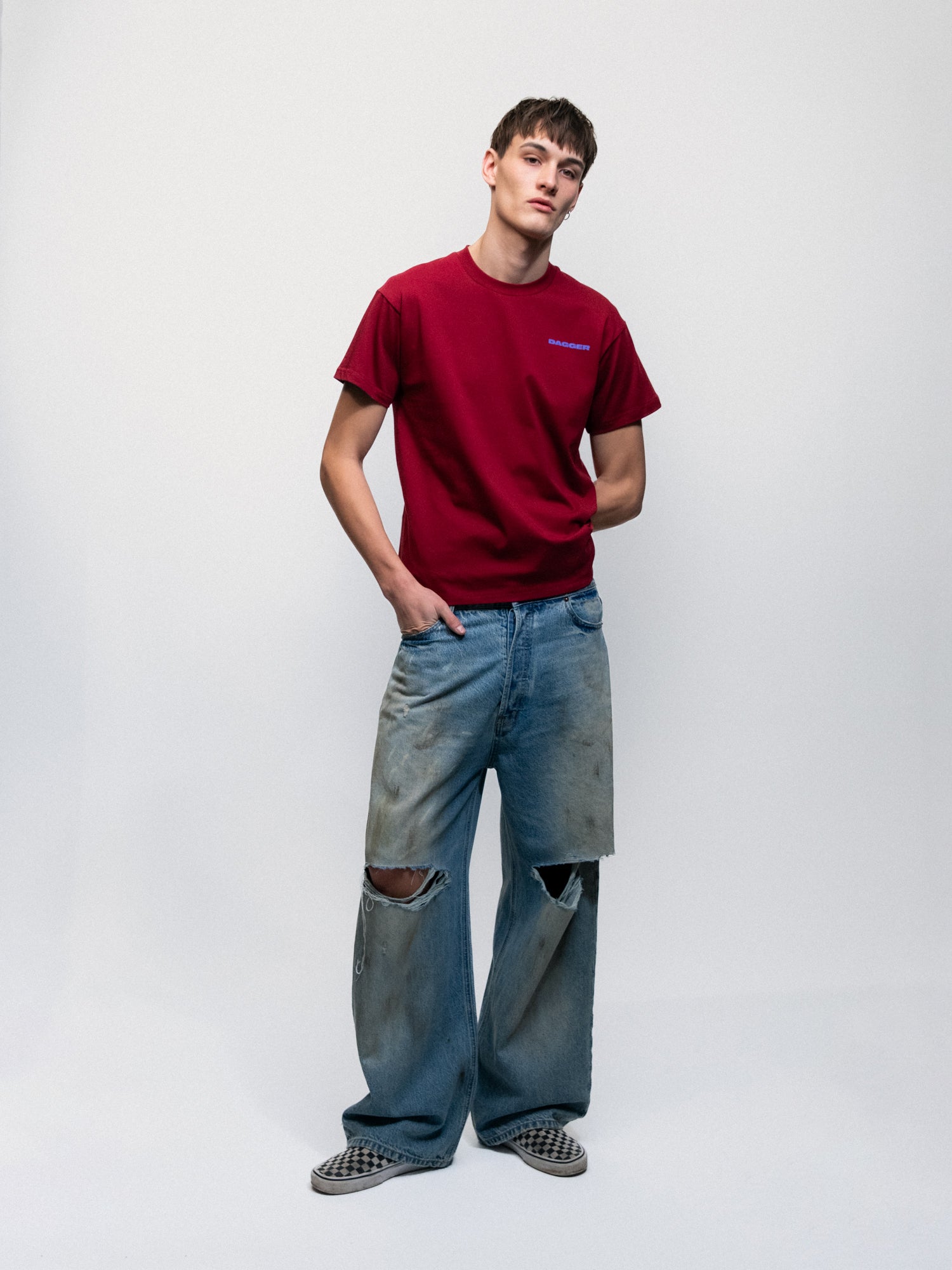 Our standard fit ts in 230gsm cotton, in color burgundy. Features a purple DAGGER logo on the left chest and shoulders, with the original slogan that started it all from founder Luke's job dismissal letter “WE WISH YOU ALL THE BEST WITH YOUR PROFESSIONAL FUTURE AND PERSONAL WELLBEING” on back.